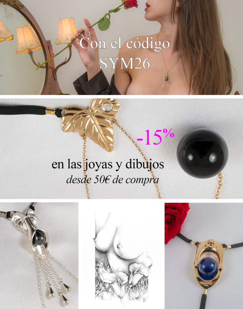 Utiliza su código SYM26 y disfruta de descuentos* en más de 300 joyas íntimas y dibujos eróticos, a partir de 50 euros de compra ! Déjese seducir para joyas para Ella : los tangas, las joyas para el pecho, las joyas para el clítoris y juguetes sexuales… Déjese seducir para adornos sin piercing para El… Déjese seducir por los originales dibujos eróticos o las obras en edición limitada de Sylvie Monthulé. *Estos descuentos no se aplican a las joyas que ya están en promoción, ni a las ofertas de fin de serie.